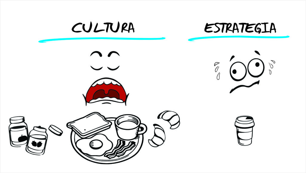 Ciertamente es lo que la frase deja dramáticamente expuesto, que la estrategia tiene la posibilidad de ser simplemente alimento de la cultura. Y digo posibilidad porqué no es una regla general que deba de ser así, pues la estrategia, en principio, define el camino hacia los resultados. Y aunque nadie diseña una ruta hacia el fracaso de forma consciente, eso no garantiza que funcione si la cultura no la respalda.